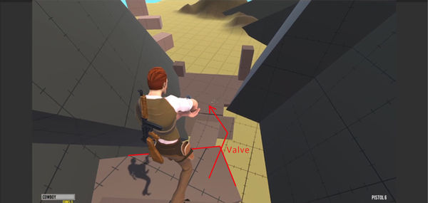 After the fight the players are rewarded with a coin but also a new accessible beach that they can start exploring. Once again, rewards are used to guide them through the open areas. There are also a few more secret areas that can be guessed by observing the environment. After climbing, the players can see the areas they played through potentially conveying a sense of accomplishment. At the end of this phase the players fall down a platform that cannot be climbed back. It is the second valve setting up the final combat.